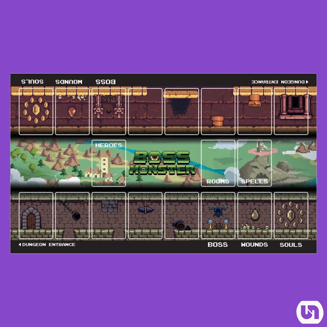 This gorgeous full-color foam play mat is inspired by the overworlds and dungeons of classic video games and and is optimized for two player games. It comes packed in a sturdy 15 inch plastic tube with hang-tabbed stopper for easy display.