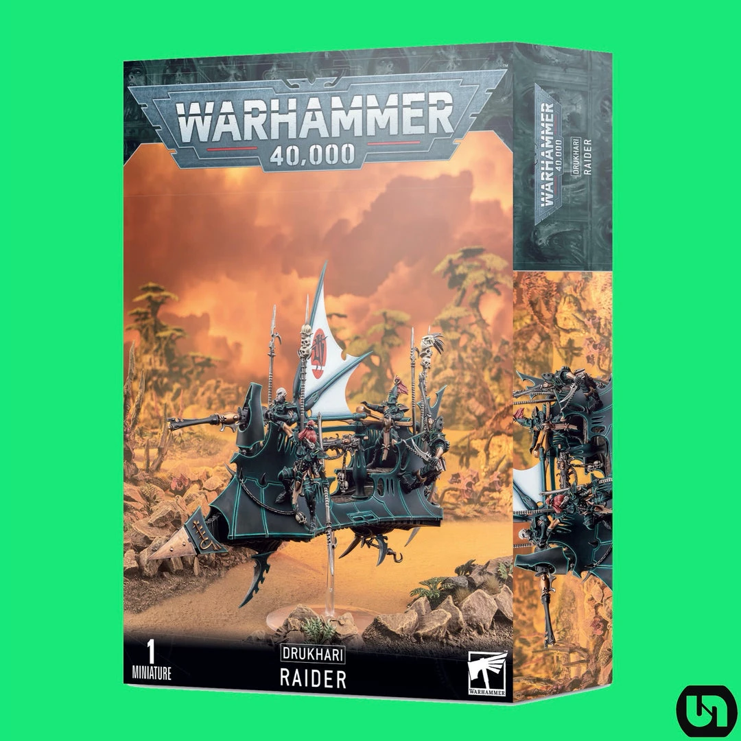 Raiders are the favoured transports of the Drukhari. Bladed skycraft, they are lightweight and extremely manoeuvrable. Raiders travel at extreme speed, using their sword-sharp fins and jagged keels to cut apart the foe, while their prow-mounted heavy weapons punish the foe.