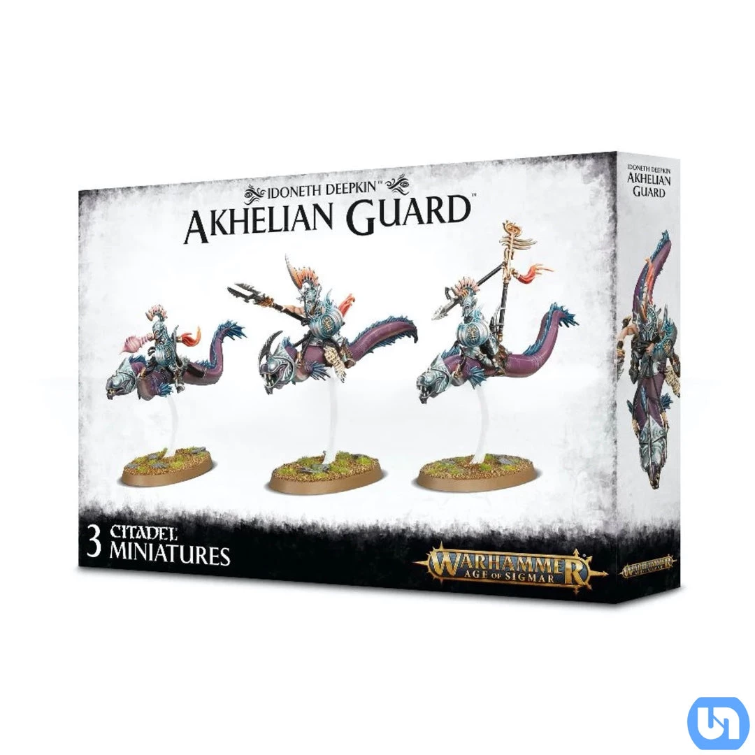 No troops exemplify the Idoneth Deepkin way of life more than the Akhelian Guard. Mounted atop Fangmora Eels, they fight in a loose formation ideal for rapid assaults and sudden retreats, typifying the hit-and-run style of war common amongst the aelves of the depths. Morrsarr Guard are armed with volt-spears and galv-shields, channeling the powerful electrical energies of their Fangmora mounts into the tips of their spears, releasing the charge as a lethal short-range bolt. Some legends tell of Morrsarr Guard formations so large that the brightness of their combined biovoltaic blasts left the entire enemy army blinded and reeling.