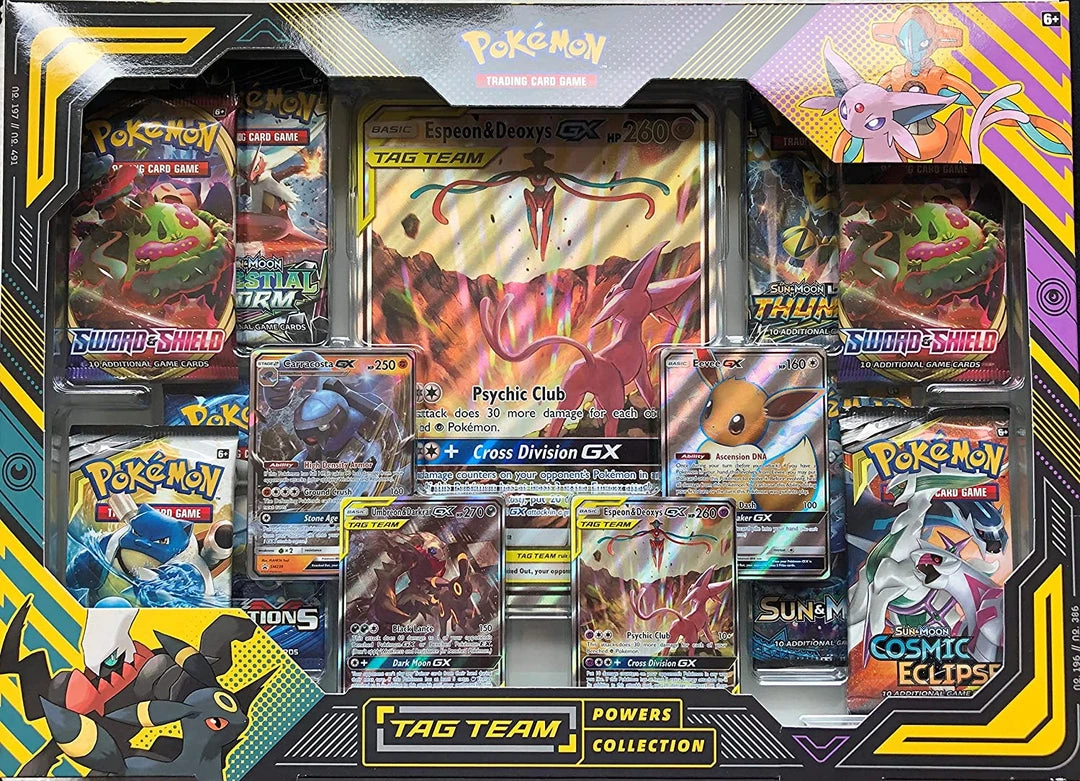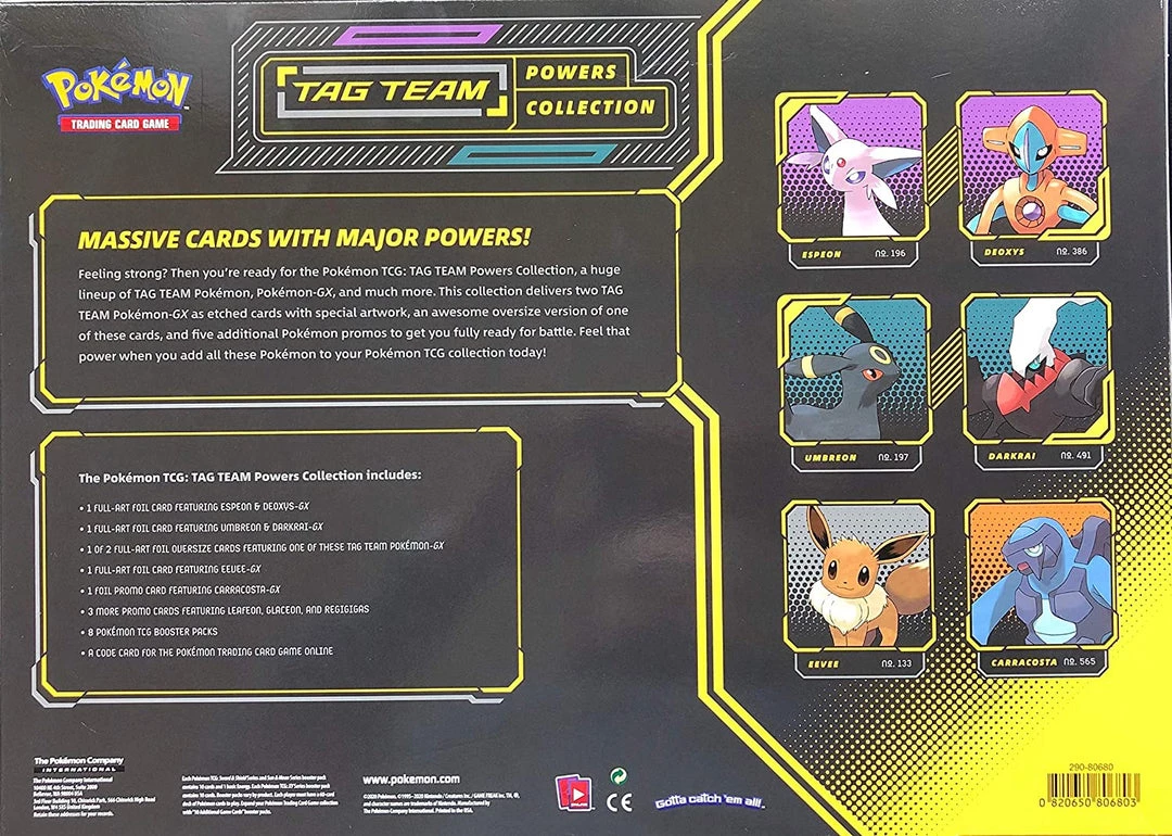 - The Pokémon TCG: TAG TEAM Powers Collection includes 1 full-art foil card featuring Espeon & Deoxys-GX and 1 full-art foil card featuring Umbreon & Darkrai-GX.