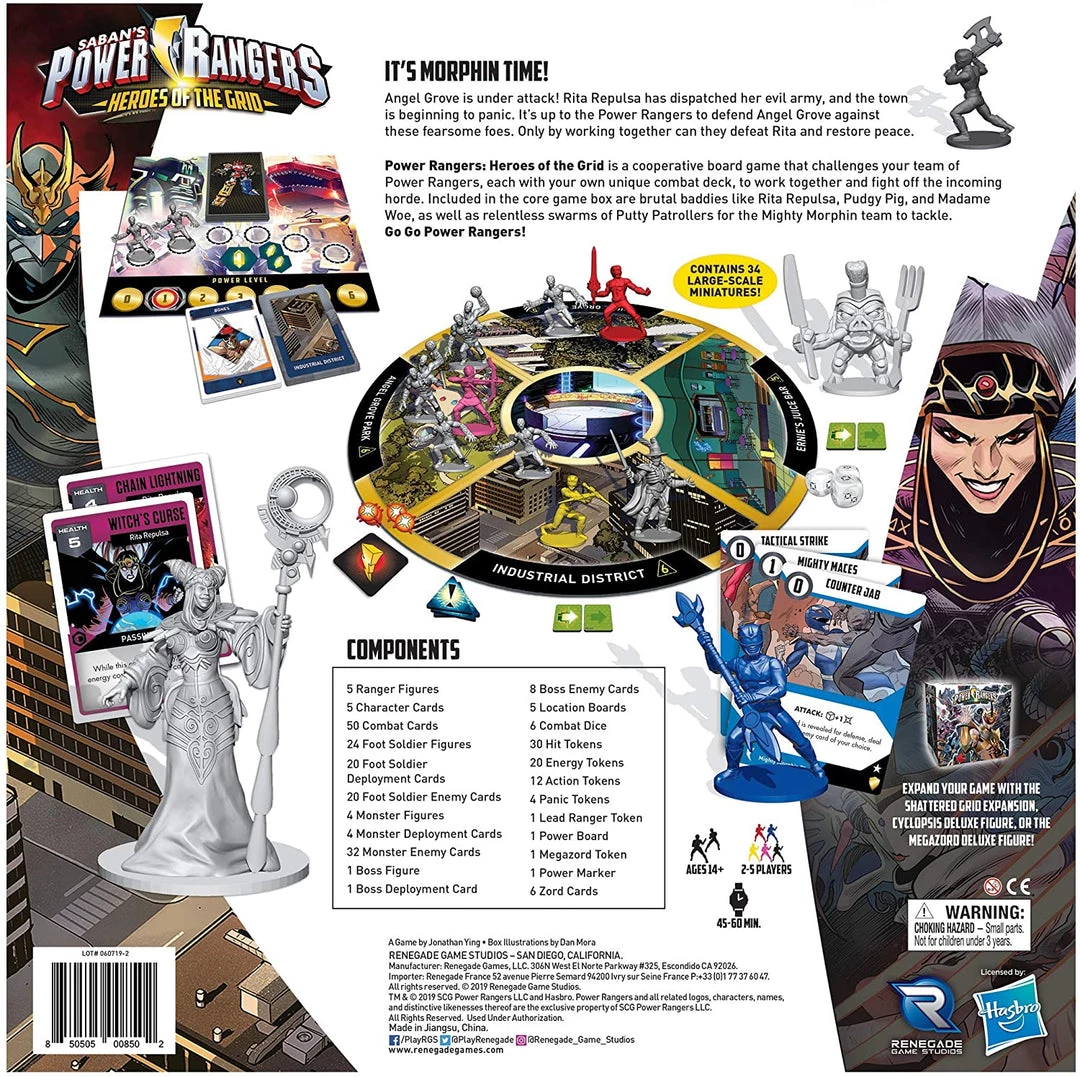 In Power Rangers: Heroes of the Grid, the players take on the roles of the original Mighty Morphin Power Rangers to battle the forces of darkness. In this core game box, you will face Rita Repulsa and her relentless swarms of Putty Patrollers and Super Putty Patrollers, as well as formidable monsters like Bones, Knasty Knight, Madame Woe, and Pudgy Pig. These teenagers with attitude must use martial arts, teamwork, and the power of the Zords to defeat the evil that threatens Angel Grove.