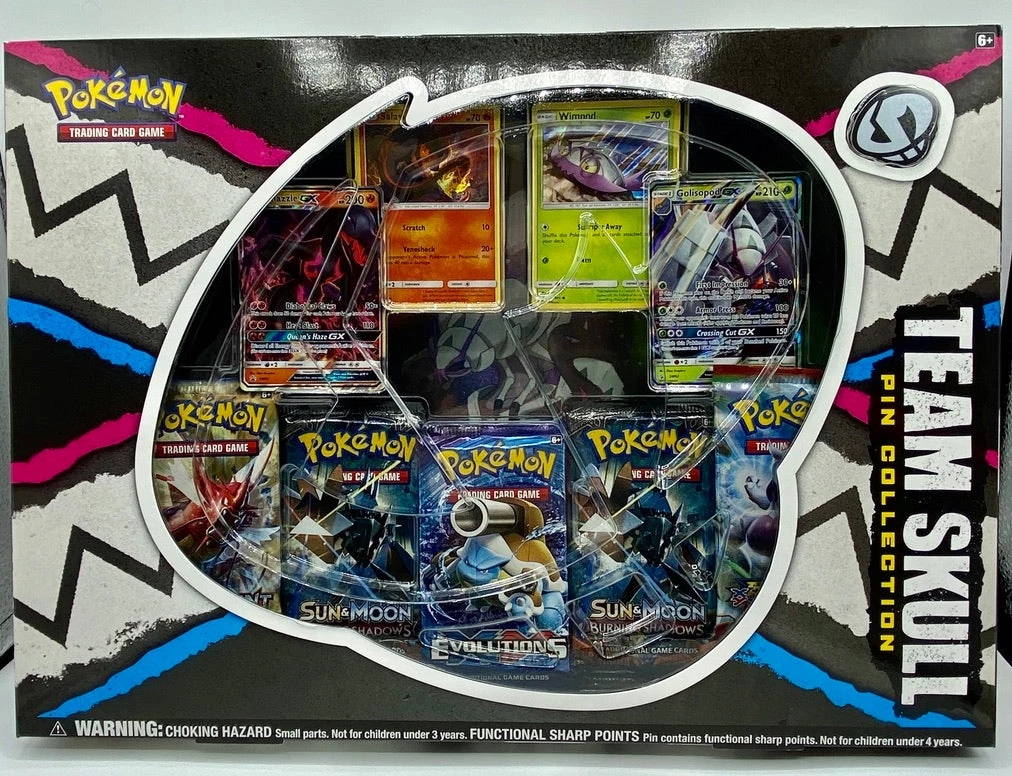 Team skull brings the beat down! The nasty crew of team skull brings poisonous heat with Salazzle-GX and double-tough cross cuts with Golisopod-GX! You get both as never-before-seen foil promo cards, plus two foil cards featuring salandit and Wimpod, and an awesome team skull logo pin.