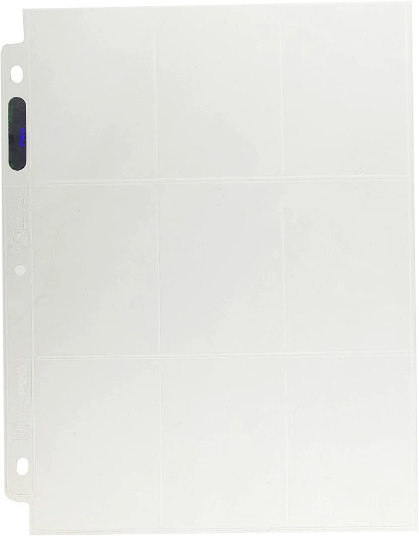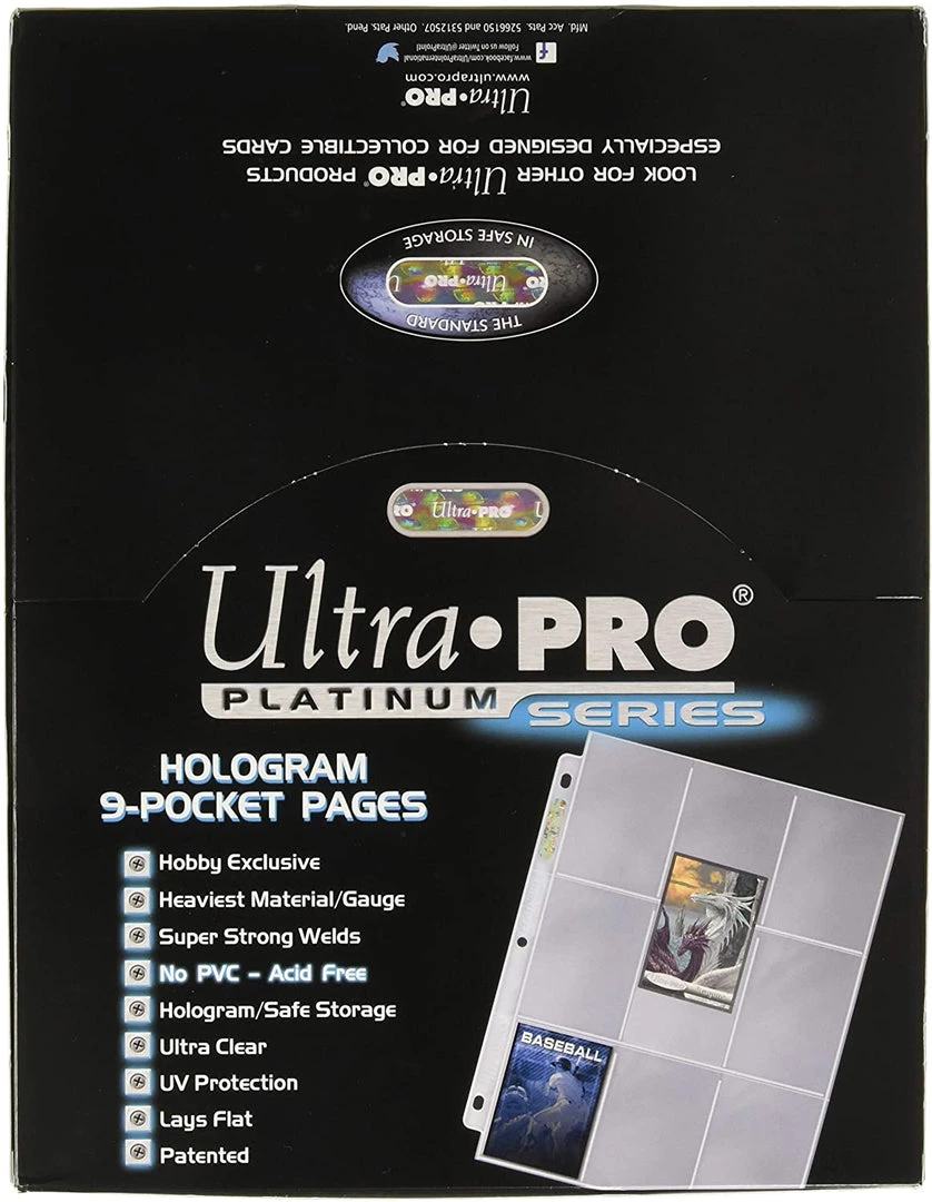 The Ultra Pro Platinum Series 9-Pocket Trading Card Pages provide a way for you to display and protect your favorite trading cards in any standard three-ring binder. Coming in a box of 100, each page holds nine 2.5 by 3.5-inch trading cards. The top-loading pages are constructed of polypropylene that is PVC and acid-free and offers UV protection to keep your cards in perfect condition. With strong seam welds, the durable heavy-weight pages are made for long lasting use.