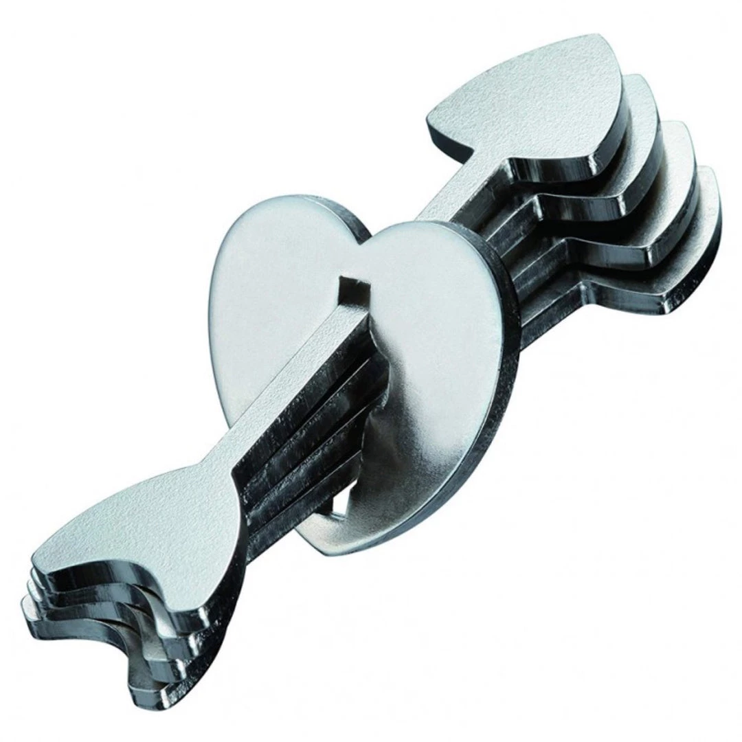 Designed with 4 arrows stuck in a heart, is it love, or a prank by Cupid? Please look carefully at each arrow and pull it out of the heart. Once removed, can you return them? Designed by a new Russian puzzle designer, Andrei Ivanov. He credits the inspiration for the puzzle on a very old idea of the Four Keys Puzzle, described by Professor Hoffmann in 1893. Approximate size = 3″ x 1.25″ x 1.25″.