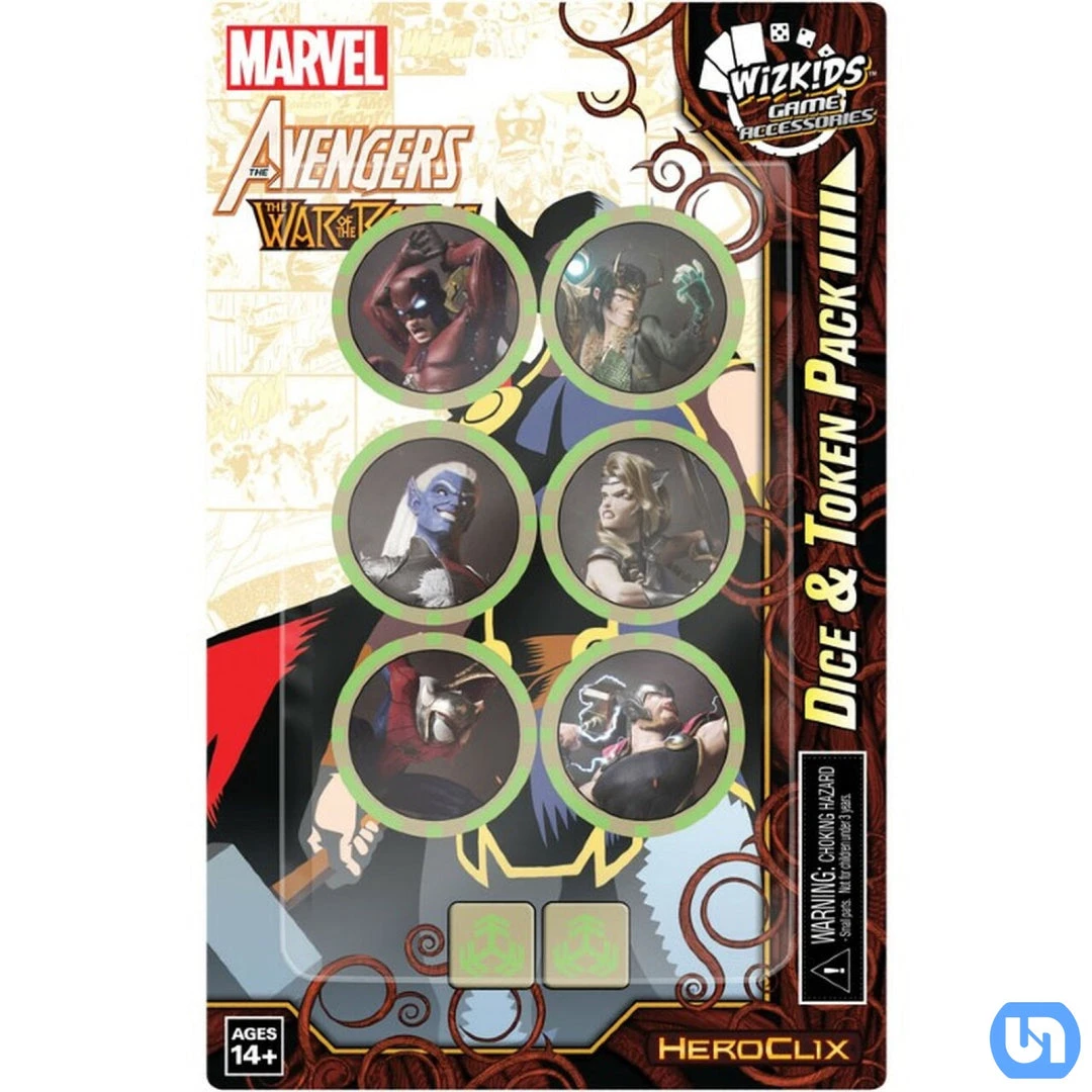 Thor and the Avengers take on Malekith and other Asgardian threats! Based on the realms-shattering The War of the Realms event, this Dice and Token Pack contain 2 custom dice featuring a special logo of the Asgardian realm, and 6 action tokens featuring characters from the story!